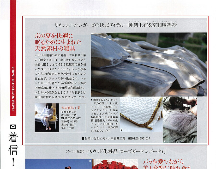 | YOU'VE GOTA GOOD NEWS 着信コーナーで 「京和晒綿紗」と「睡楽上布」が 取り上げられています。 ←クリックで大きな画像へジャンプ |