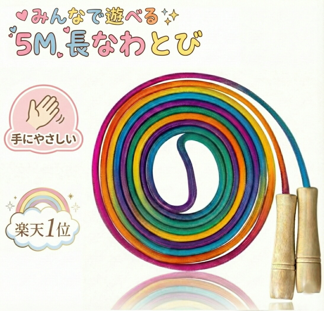 買ったばかりなのに縄のところがすこしほどけててショックでしたが連絡したらすぐ対応していただきありがとうございます! 色は可愛くてレインボーで子供も喜びそうです! 保育園で縄跳び頑張っているようなのでおうちでも練習用に購入しました!