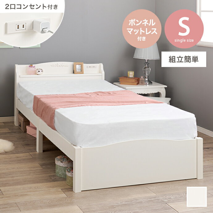 ベッド シングルベッド すのこベッド マットレス付きベッド マットレス付き シングル すのこ コンセント付き 2口 ボンネルコイルマットレス 組立簡単 宮棚 一人暮らし ワンルーム かわいい 脚付き 幅98.5