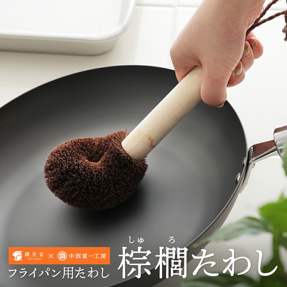 洗剤を使わずに洗う鉄フライパンのため作られた便利な柄つきのタワシ。棕櫚でできているので程よい弾力が汚れをかき落としてくれます。絶妙な角度が使いやすくて、使えばきっと鉄フライパンとセットで手放せない相棒になるはず。