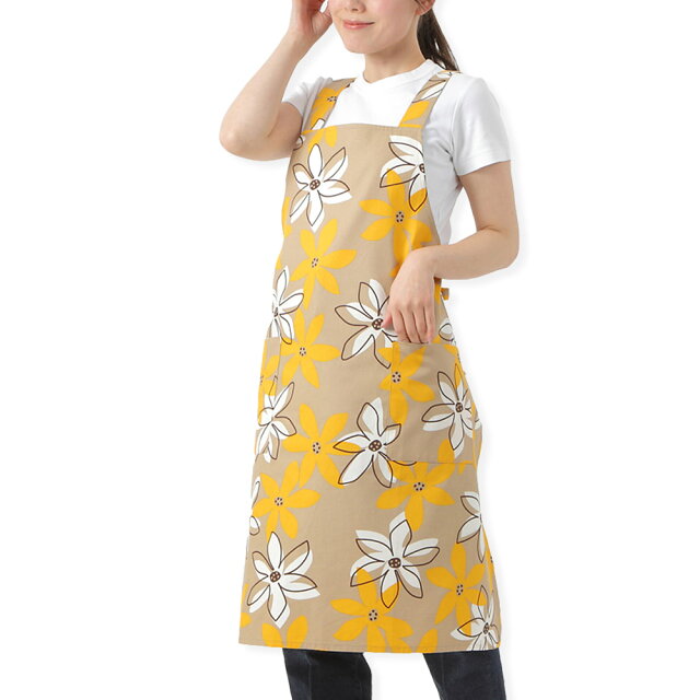 パッと目を引くおしゃれな大柄デザインが鮮やかで、いつもの家事や仕事が楽しくこなせます。汚れてもざぶざぶ洗える綿100%の中厚のしっかりした生地を採用。長く愛用していただけるクオリティです。