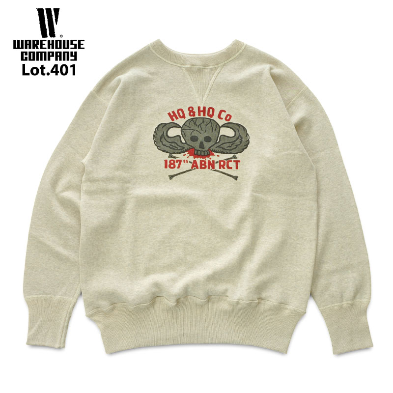 【WAREHOUSE】 ウエアハウス Lot 401 HQ & HQ CO 両V セットイン スウェット 多色プリント トレーナー ロゴ 裏起毛 長袖 オートミール アメカジ
