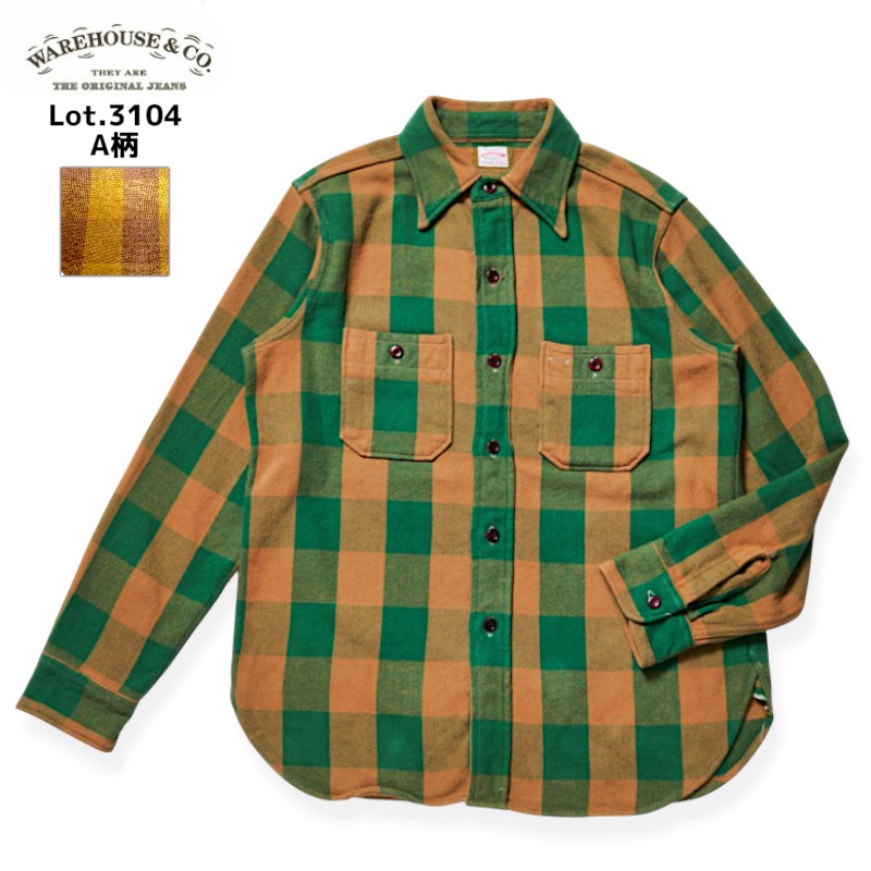 【WAREHOUSE】 ウエアハウス Lot 3104 フランネルシャツ A柄 ネルシャツ ワンウォッュシュ グリーン マスタード