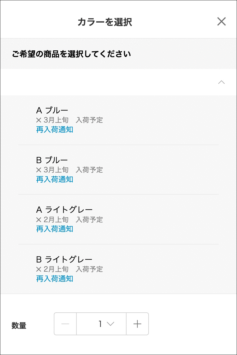 入荷時期は配送予定欄に表示しています。表示がない商品は「商品の種類を選択」ボタンをタップすると再入荷の時期が表示されます。