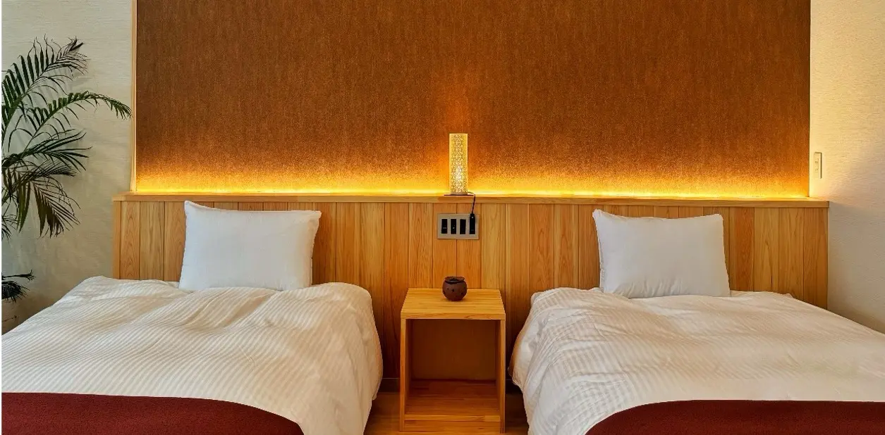 癒されるよう熊野杉などを用いて造られた客室。