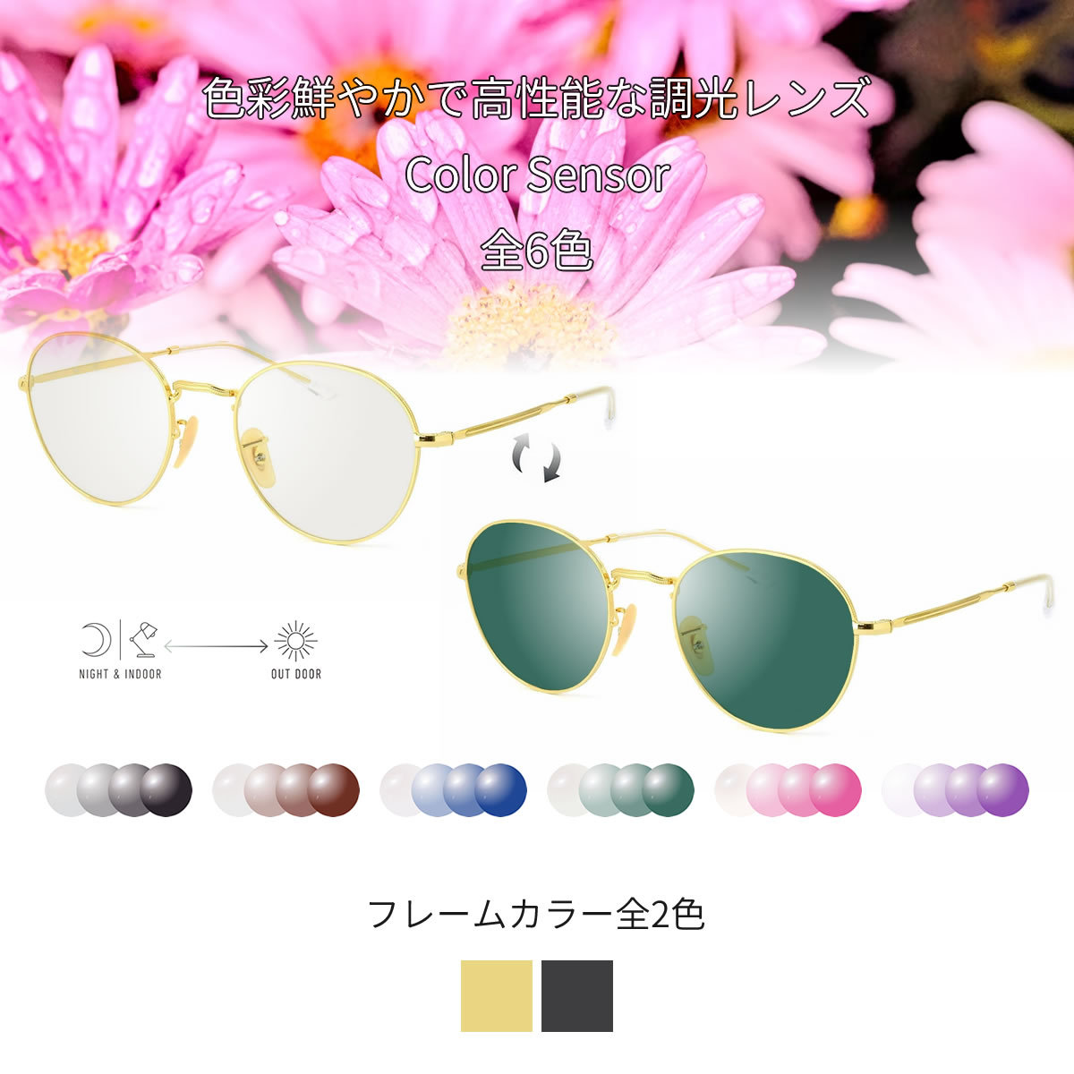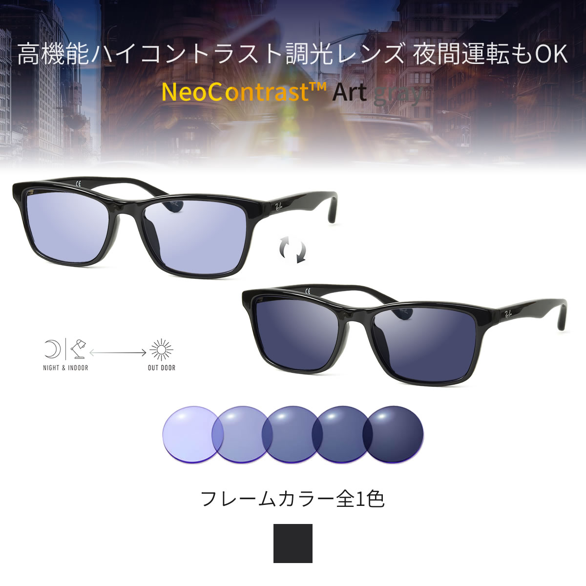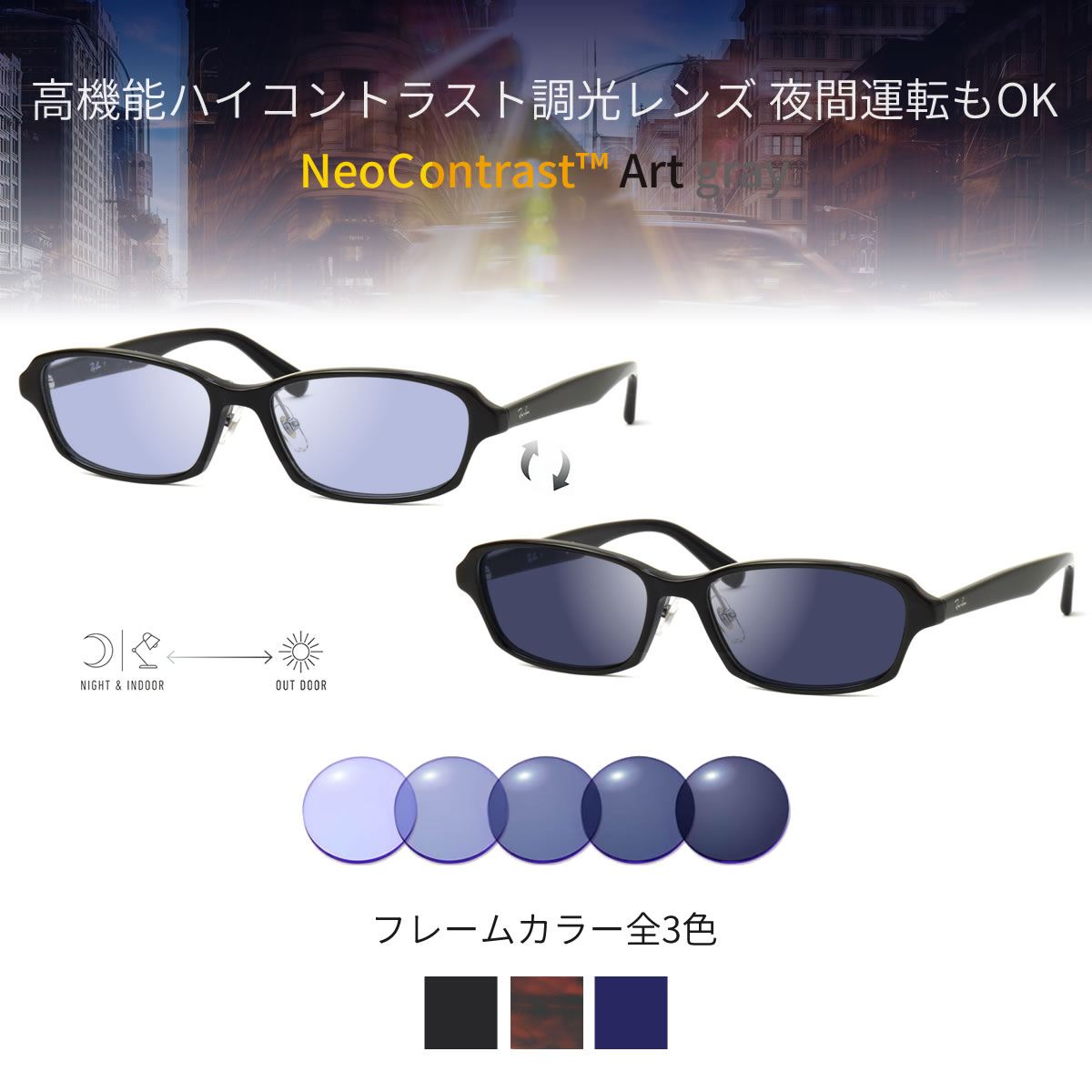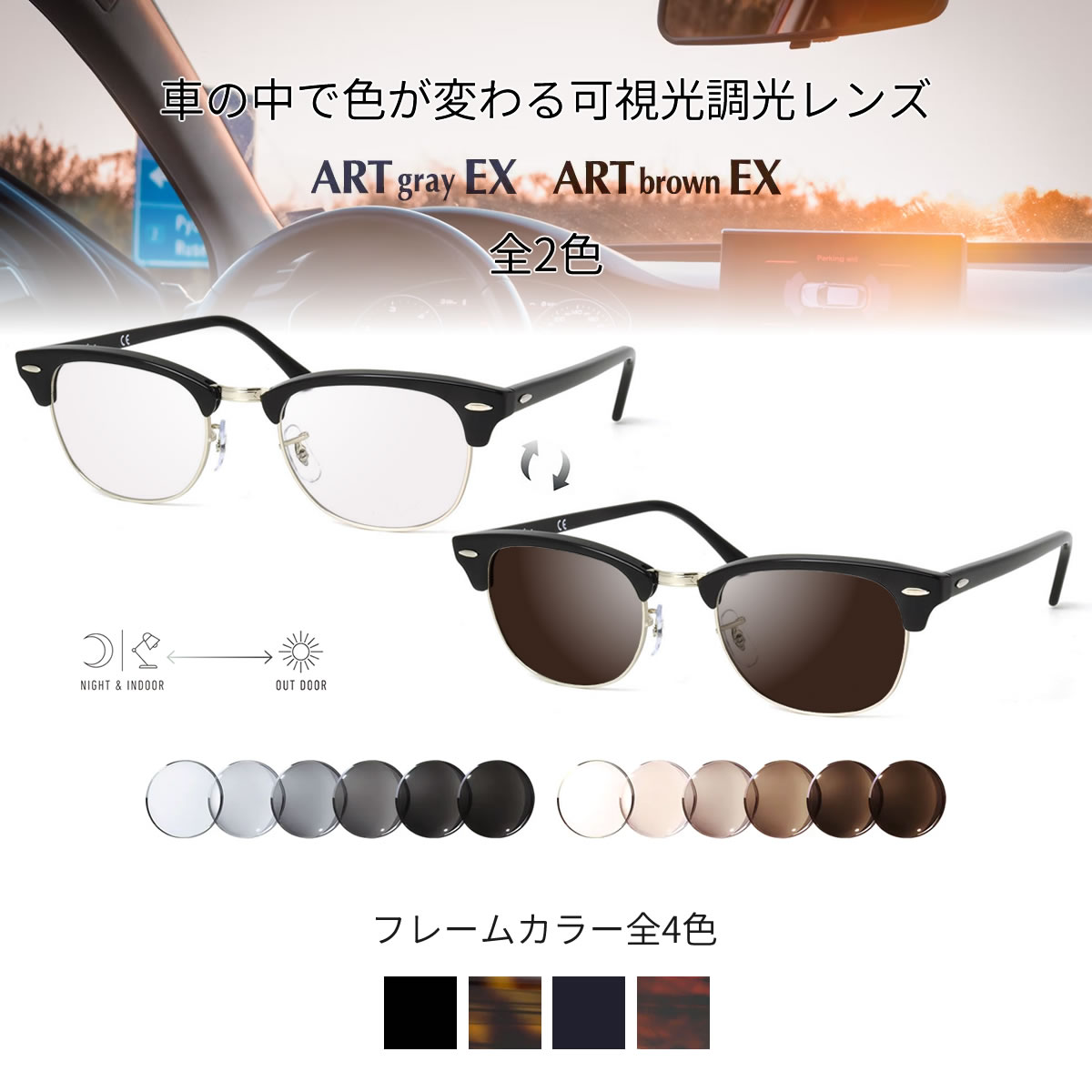 室内ではクリアに、屋外ではしっかり濃く、車内でも調光するため、ドライブにも最適です。