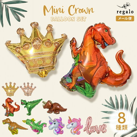 お誕生日は王冠バルーンでかわいさアップ♪ミニ王冠+恐竜またはユニコーンなどが、1個ずつセットになった8種類。
