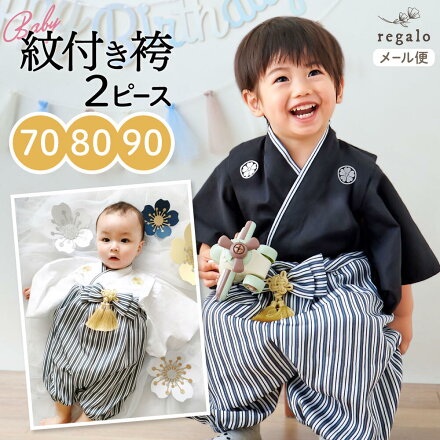 脱ぎ着しやすい2ピースタイプ♪光沢が美しい家紋刺繍入り。縞模様のちりめん風の下衣で素材にもこだわった高見えするベビー袴です。